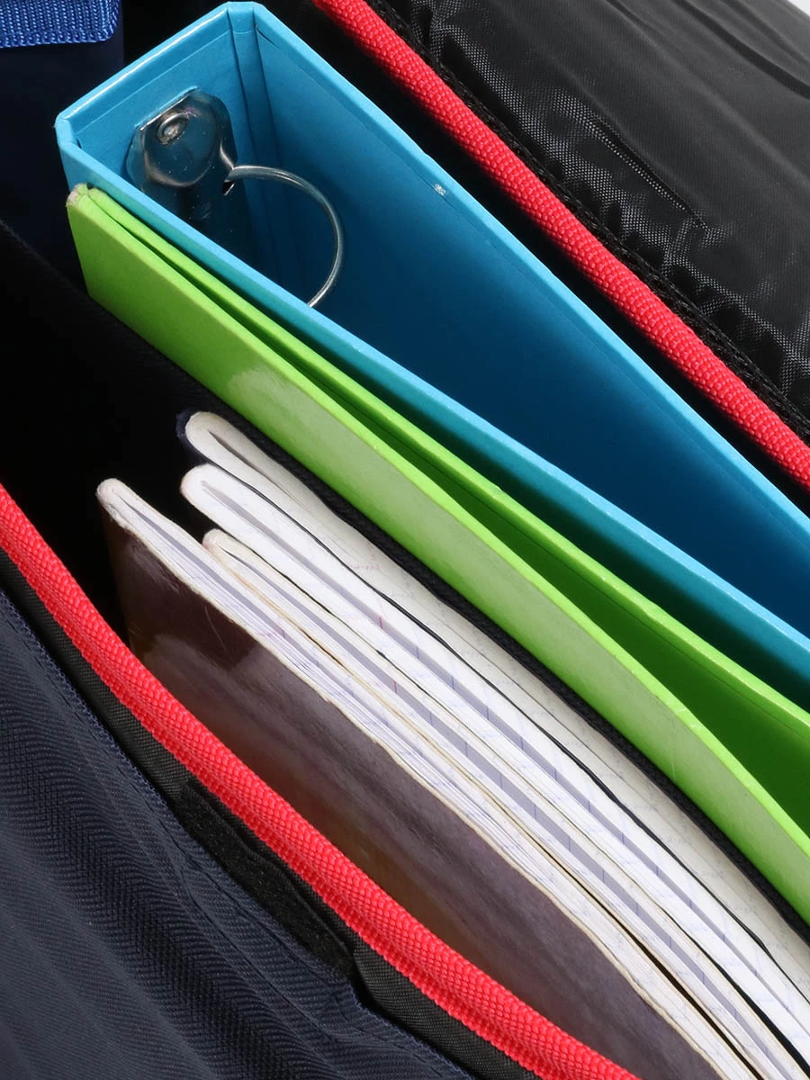 Le cartable Fédération Française de Football Le Coq possède 2 grands compartiments compatibles 24 x 32 cm dans lesquels cahiers, classeurs, livres et trousse peuvent aisément être glissés. Pour éviter de retrouver le goûter écrasé au fond du sac, il est possible de le ranger à part dans sa poche frontale à attache velcro.