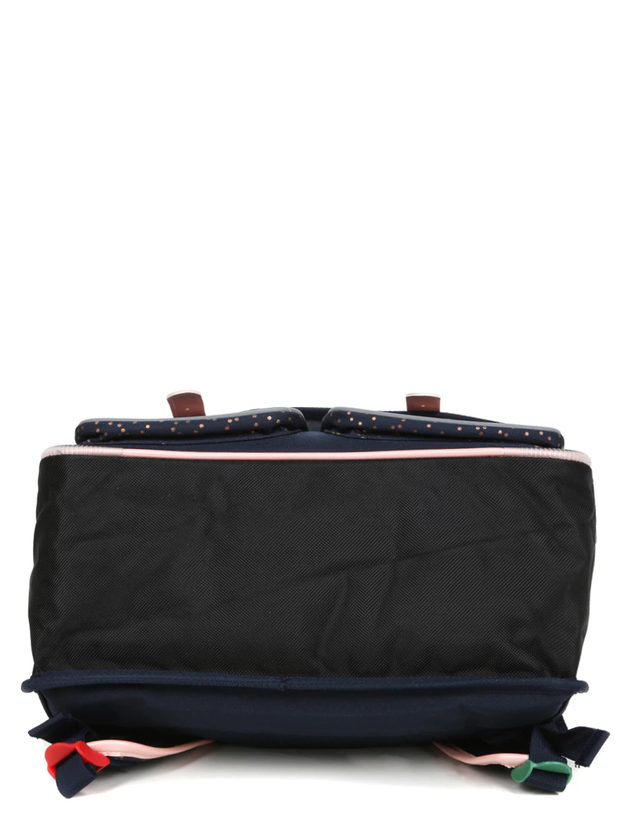 Le cartable Kickers Girl 38 cm réunit tout ce qui fait le charme rétro de la célèbre marque dans une version girly qui devrait faire des jalouses dans la cour de récréation, parmi les jeunes élèves en classes de CP, CE1 et CE2. Son revêtement bleu marine est relevé de finitions en simili-cuir rose, d’un porte-adresse en forme de fleur et de pois dorés sur les poches frontales. Bien conçu, il présente un aménagement très fonctionnel et un système de portage ergonomique. Fabriqué en polyester 900 deniers et renforcé au niveau des angles inférieures et du fond, il offre une bonne résistance aux frottements.