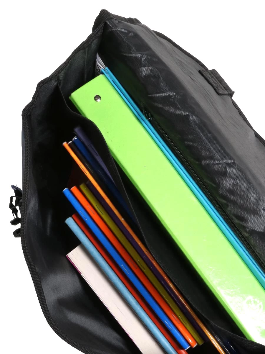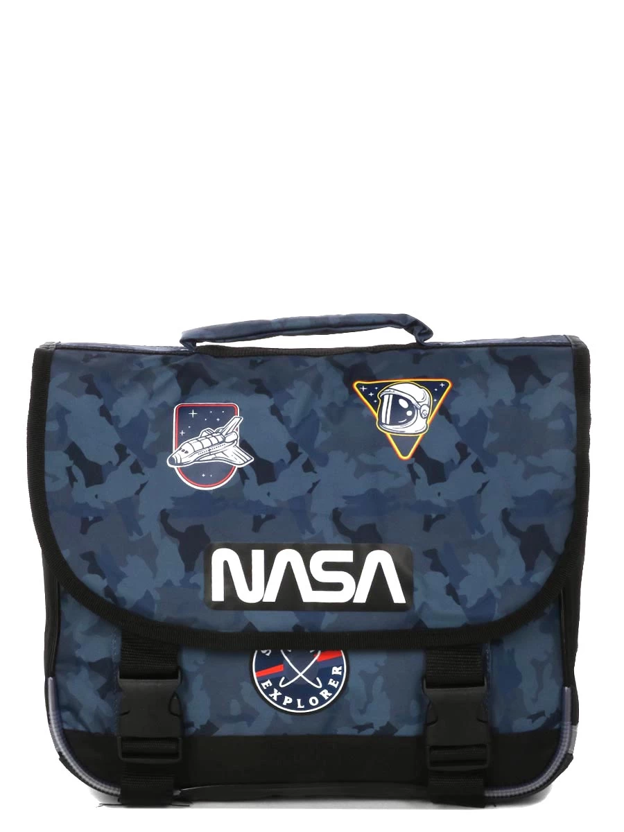 Le rabat du cartable Nasa Space Explorer dévoile un compartiment avec doublure intérieure pouvant loger des cahiers et classeurs à anneaux de formats A4 et 24 x 32 cm, des manuels et une trousse. Quelques petites fournitures peuvent être sériées à part dans sa poche intérieure zippée. L’agenda, le set de géométrie et de quoi s’amuser à la récréation se glissent dans sa poche frontale.