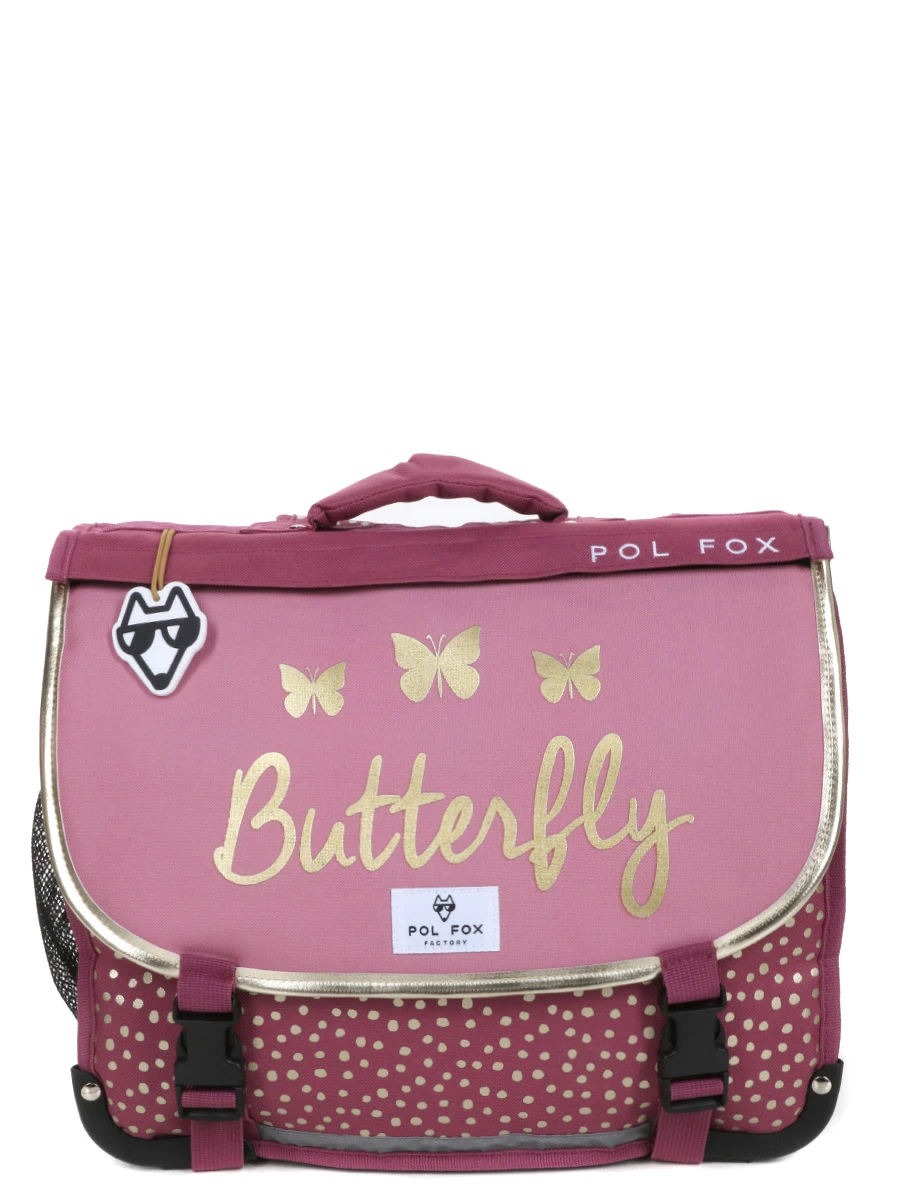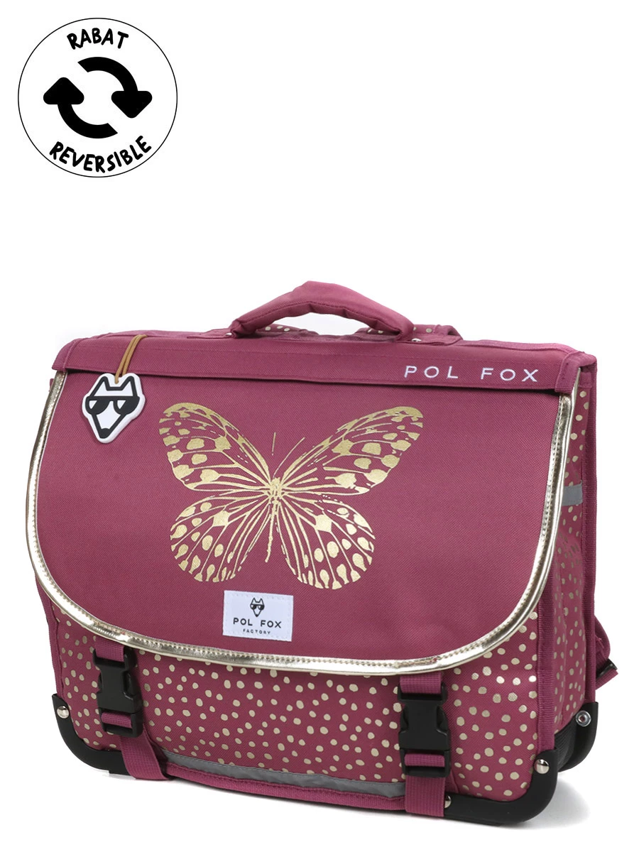 Le cartable Réversible Pol Fox Butterfly 38 cm adoucit les départs pour l’école avec son joli revêtement rose orné de pois et de papillons dorés. Un style très doux et poétique auquel seront sensibles les fillettes du CP au CE2. Il s’agit d’un véritable cartable deux-en-un grâce à son rabat réversible. Souligné d’une jolie finition en simili-cuir doré, celui-ci se fixe à l’aide d’un simple scratch et affiche d’un côté un grand papillon et de l’autre trois plus petits accompagnés de l’inscription « Butterfly ». On apprécie également l’aménagement fonctionnel et la solidité du cartable ainsi que les détails pratiques comme ses bandes réfléchissantes et son porte-adresse.