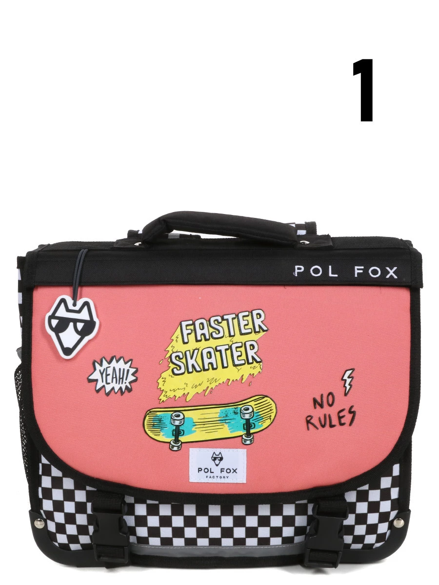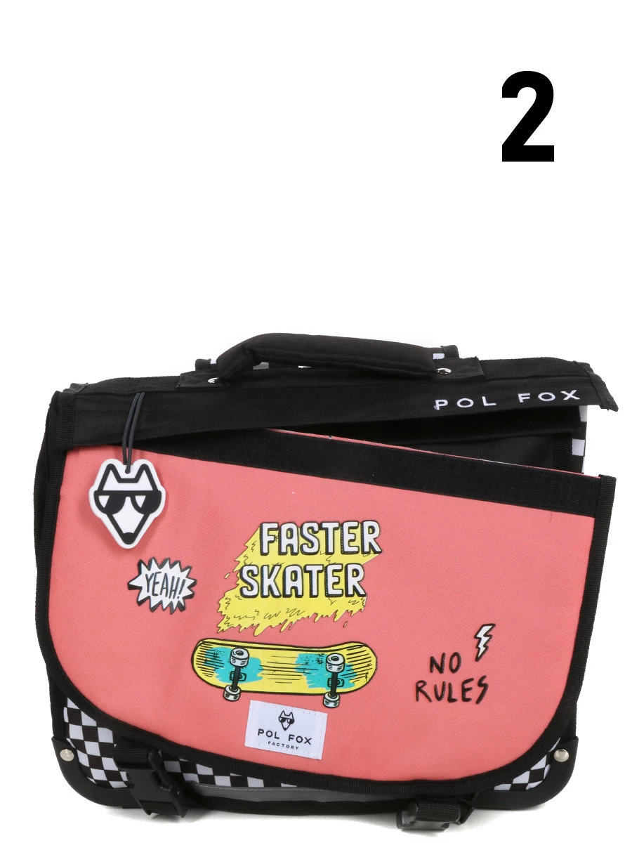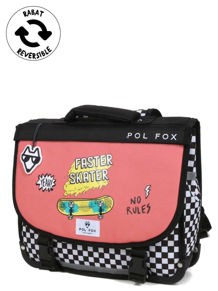 Le cartable Réversible Pol Fox Skate 2 – 35 cm est parfait pour filer à l’école en skateboard ! Dès le CP et le CE1, les jeunes adeptes de planches à roulettes arboreront avec plaisir ce cartable aux couleurs de leur loisir préféré. Selon les jours, ils choisiront l’un ou l’autre côté de son rabat réversible, orné de dessins rappelant l’ambiance du skatepark. Ce cartable soigne son style sans oublier l’essentiel : fonctionnalité, confort et durabilité sont aussi au rendez-vous, ainsi que la sécurité grâce à l’ajout de détails réfléchissants.