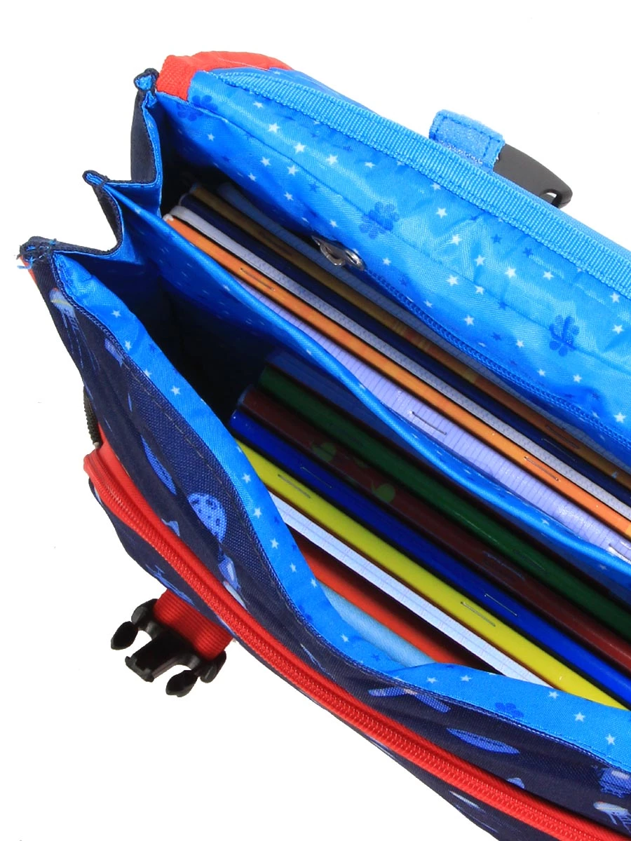 Le cartable CP – CE1 Snowball Kid Robot Dino possède deux compartiments dans lesquels manuels et cahiers peuvent être soigneusement triés. Une poche intérieure permet de garder la carte de cantine à l’abri. La règle dispose quant à elle de son emplacement réservé. Des sangles à scratch la maintiennent pour éviter qu’elle n’aille se cacher dans le fond. Les petits accessoires comme le goûter trouvent un place en accès rapide dans la poche frontale située sous le rabat.