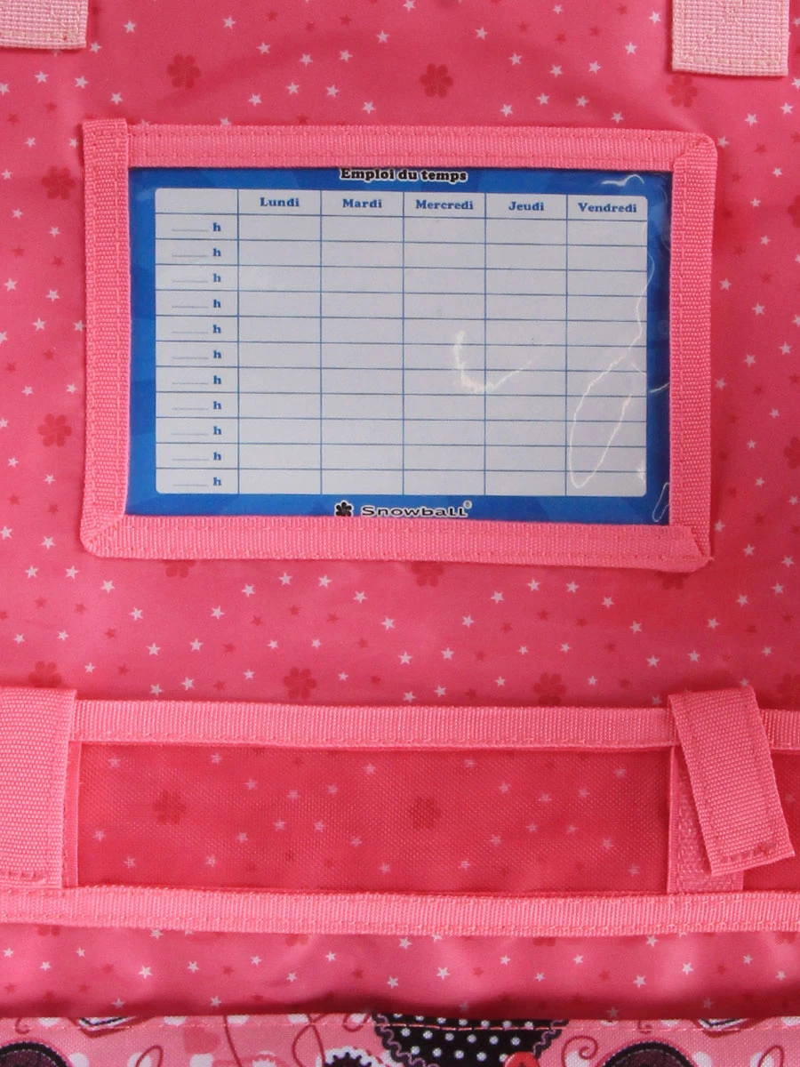 Le cartable CP – CE2 Snowball Romantique Coeur est équipé de deux compartiments pour favoriser l’organisation minutieuse des divers classeurs et cahiers en s’aidant du porte emploi du temps situé derrière le rabat. La carte de cantine et autres petits accessoires importants peuvent être glissés dans la poche intérieure zippée. Finies, les recherches frénétiques de la règle pour souligner un titre en pleine évaluation : un passant muni de bandes velcro la maintient à sa place. Cahier de texte et crayons de couleurs peuvent quant à eux se loger dans la poche frontale pour un accès rapide.