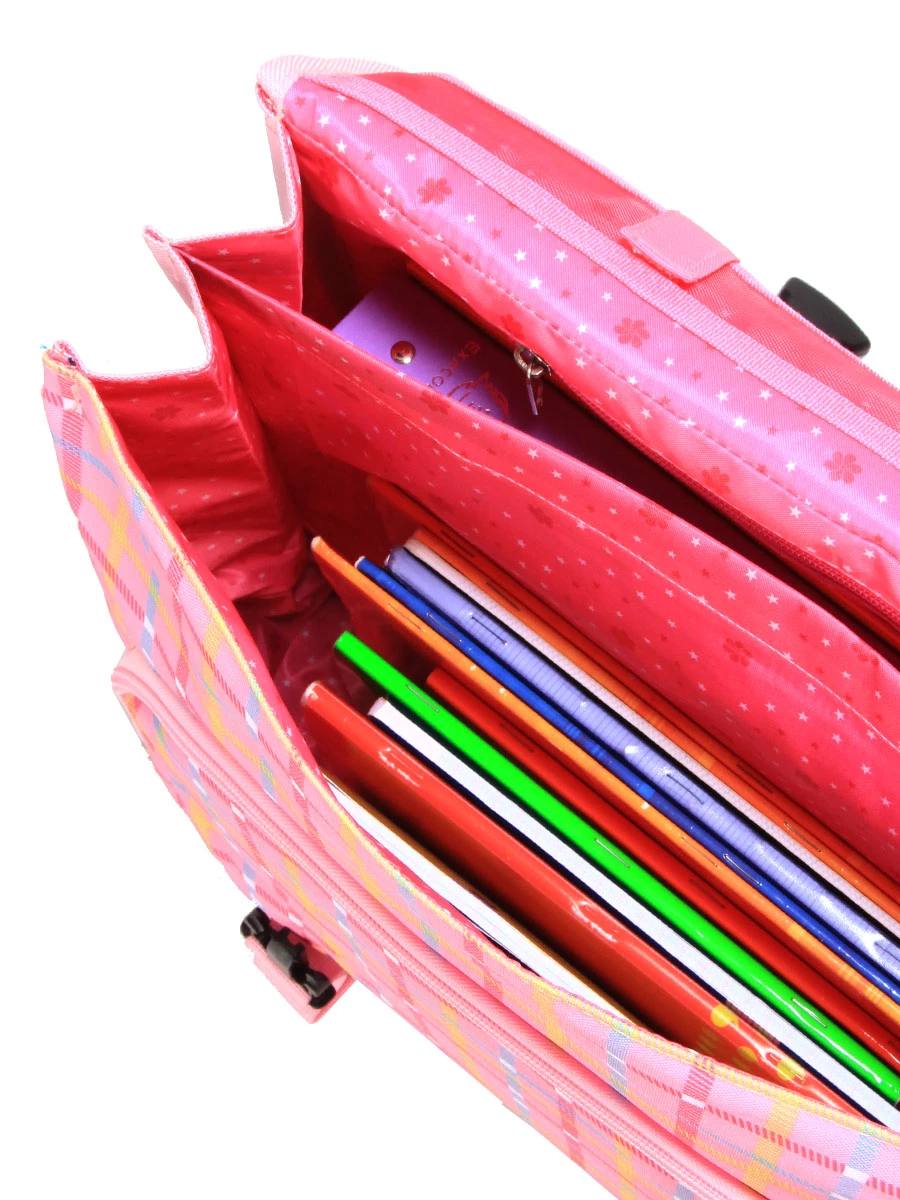 Les cahiers peuvent être organisés efficacement dans le cartable ergonomique Snowball Romantique Licorne grâce à ses deux compartiments et son porte-planning. La carte de cantine est à l’abri dans la petite poche intérieure zippée. Un passant équipé de scratch permet de maintenir la règle à sa place et d’éviter qu’elle ne se cache dans un classeur. Une poche frontale permet de garder les petits cahiers de brouillon et de texte à portée de main. En cas de perte, il est facilement restitué à son propriétaire grâce au porte-étiquette situé dans le dos.
