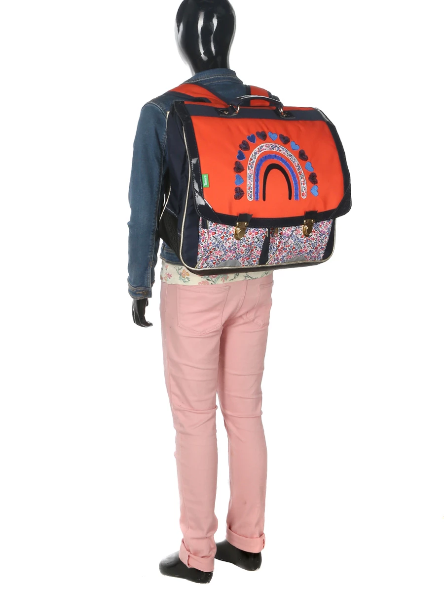 Le cartable Tann’s Jeanne 41 cm apporte une touche de feel good dans la journée d’école. Son revêtement en polyester recyclé éco-responsable arbore en effet un arc-en-ciel fait de cœurs et de paillettes pour le plus grand plaisir des petites filles aux penchants romantiques. Il est compatible A4 et 24 x 32 pour répondre aux besoins des élèves de CE2, CM1 et CM2. Pour sécuriser sa porteuse sur le trajet de l’école pendant les matinées hivernales, il est équipé de détails réfléchissants.