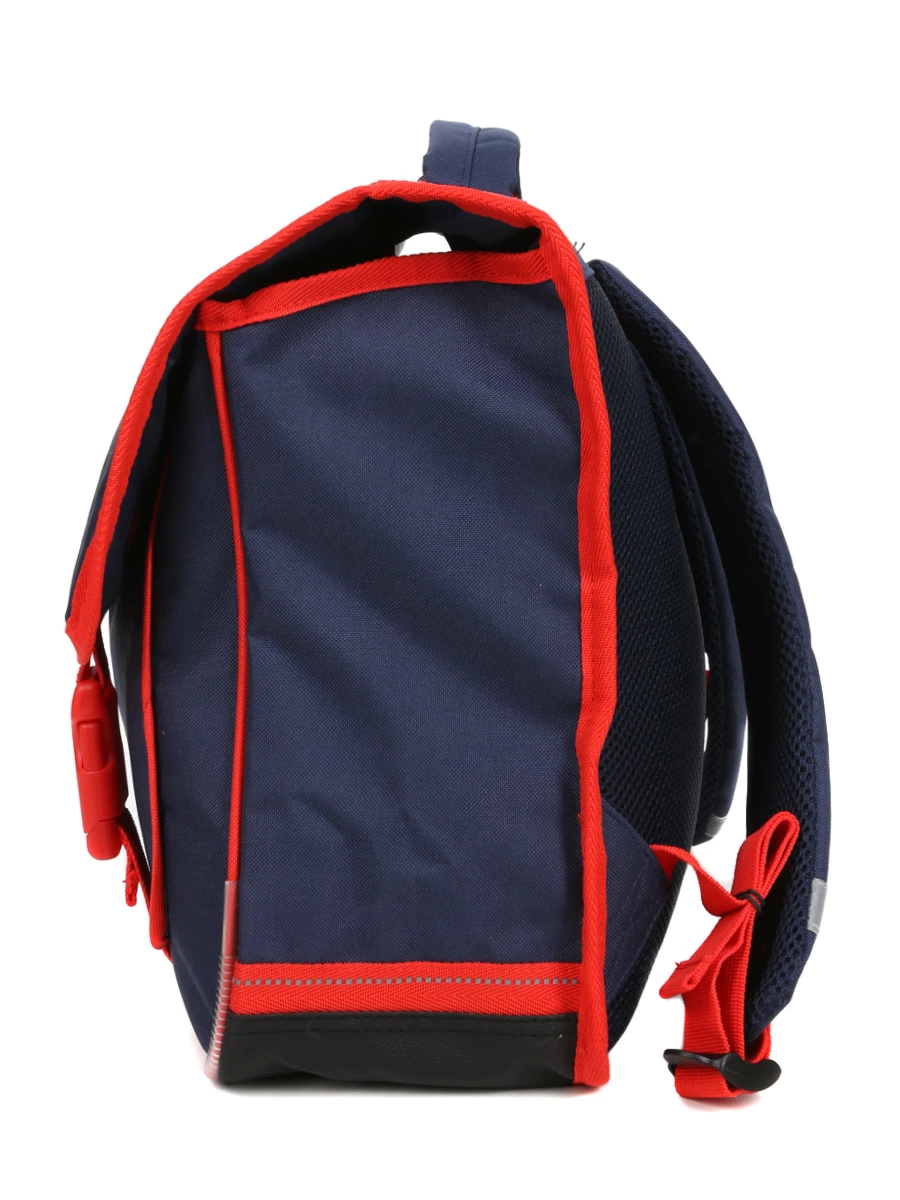Les attaches à clip du cartable Avengers Focus sont facilement maniables par les jeunes enfants. Le rabat s’ouvre sur deux compartiments permettant de classer par exemple les affaires du matin et celles de l’après-midi. Ces espaces accueillent les cahiers et les classeurs de formats A4 et 24 x 32 cm ainsi que les livres scolaires, la trousse et l’agenda. Pour pouvoir saisir rapidement son paquet de mouchoirs ou la barre de céréales à la récréation, il suffit de les placer dans la poche frontale. Bien protégé dans sa partie inférieure par le fond et les coins renforcés, ce cartable craint peu les chocs ou l’humidité lorsqu’il est posé au sol.
