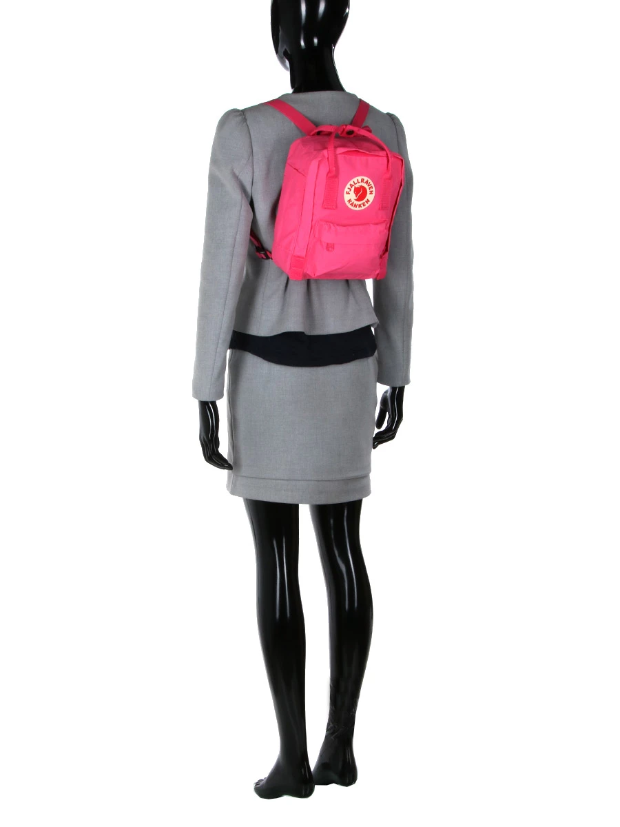 Le sac Fjällräven Kanken Mini dispose d’un compartiment (non compatible avec le format A4) et d’une poche plate permettant d’emporter quelques affaires ou un change, par exemple. Sur les côtés, ses poches ouvertes sont utiles pour y placer une gourde, un parapluie ou une petite bouteille. A l’avant, sa poche zippée permet de laisser accessible certains effets personnels comme le porte-feuille ou le téléphone.