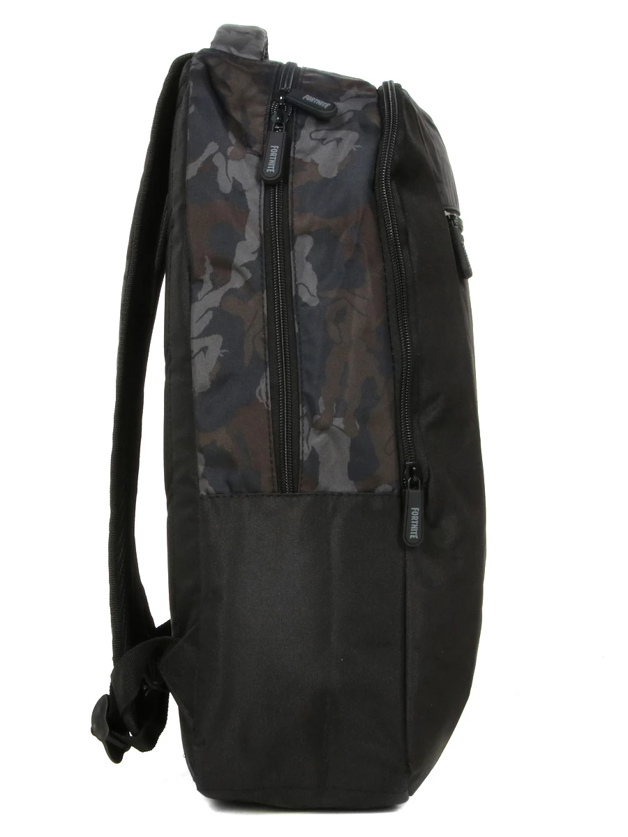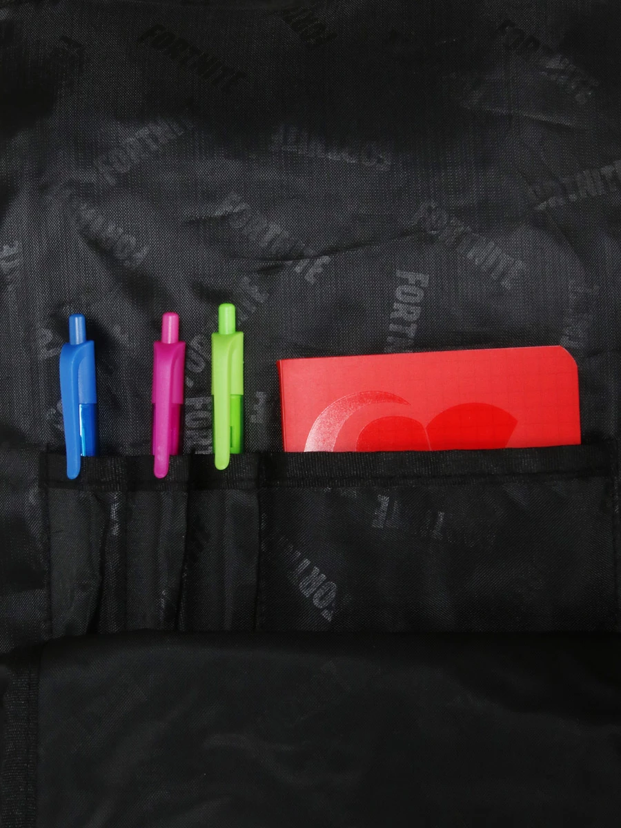 Le sac à dos ergonomique Fortnite Camo dispose de deux compartiments. Le plus grand peut accueillir tous les cahiers et classeurs nécessaire à la journée de classe et dispose d’une poche rembourrée pouvant accueillir un ordinateur jusqu’à 14 pouces, ou simplement maintenir des documents à la verticale pour ne pas les froisser. Le deuxième compartiment, plus petit, est parfait pour la trousse, les crayons de couleur, et autres accessoires. Il est équipé d’une poche plate pouvant loger un téléphone portable et sa coque, et 3 passants pour stylo. La poche frontale est parfaite pour des clefs, l’agenda, un livre au format poche par exemple.