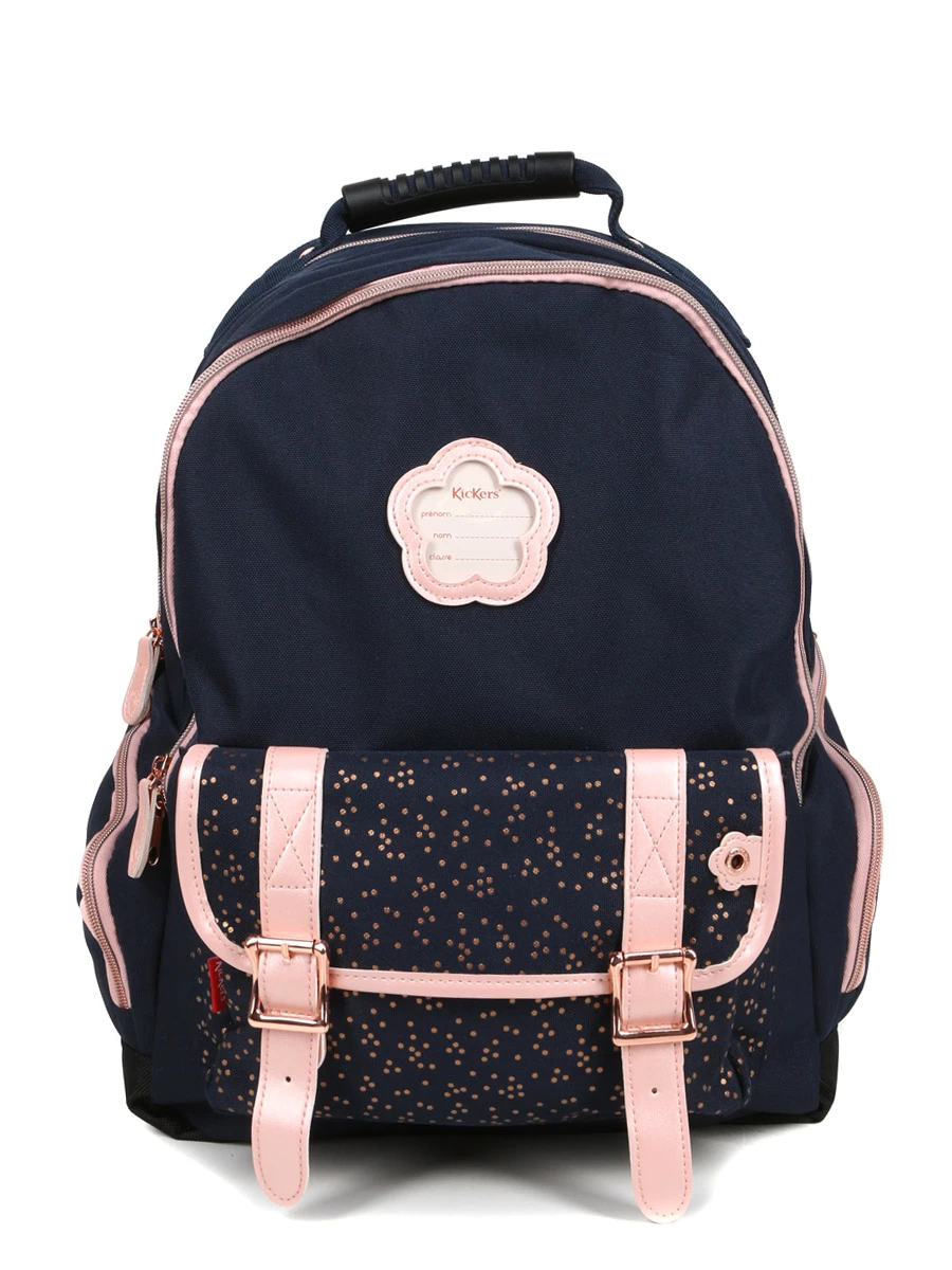 Le sac à dos Kickers Girl affiche un look délicieusement rétro et raffiné avec ses détails signature de la marque et ses touches féminines. Le célèbre logo apparaît, embossé, sur un œillet métallique décoratif et sur les tirets de zips des compartiments, un porte-adresse en forme de fleur orne la paroi avant, la poche frontale cache sa fermeture pratique par boutons aimantés sous des sangles à boucle décorative et le revêtement bleu nuit est relevé de finitions en simili-cuir rose, de détails en métal or rosé et de pois de la même teinte sur la poche frontale. Les vastes capacités de rangement du sac correspondent aux besoins en classes de CE2, CM1 et CM2. Sa conception en polyester 900 deniers lui assure une bonne durabilité. Enfin, particulièrement soigné sur le plan de l’ergonomie, il facilite le portage des fournitures scolaires.