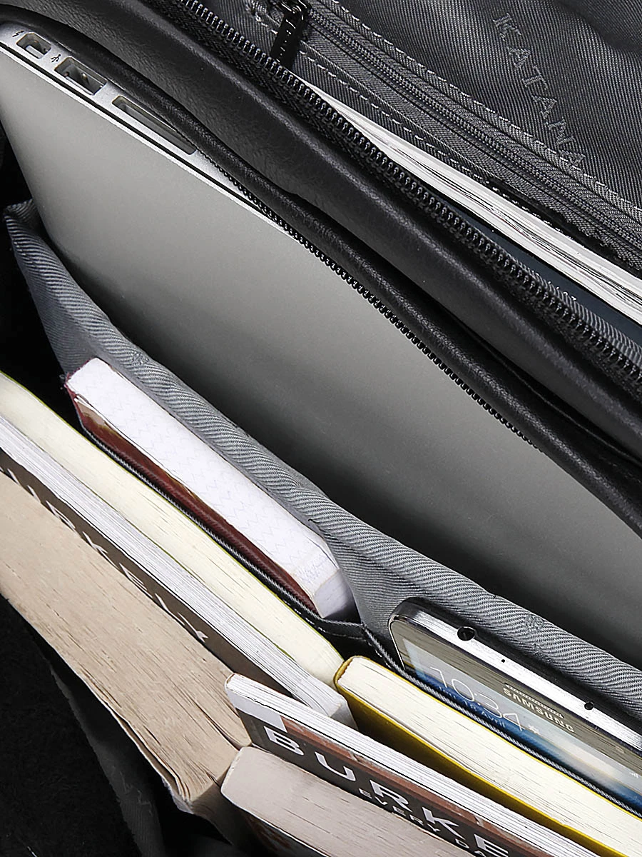 Le sac à dos Katana Attitude offre un compartiment avant spacieux convenant pour des mémos, des pochettes et des livres, entre autres. Pour un ordinateur jusqu’à 13 pouces, une poche matelassée spécifique est présente. Petites fournitures de bureau ou accessoires multimédia peuvent être rangés dans l’une de ses 2 poches ouvertes. Son compartiment arrière permet de glisser à part les documents relatifs à la prochaine réunion. Là, une poche zippée permet de laisser à part le portefeuille, par exemple. Sa poche frontale permet de garder sous la main trousseau de clés, pass pour les transports, badge d’accréditation… A l’arrière, une dernière poche est discrètement intégrée à son dossier.