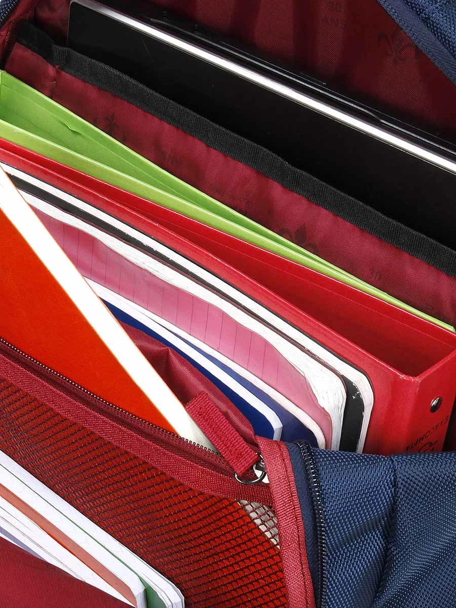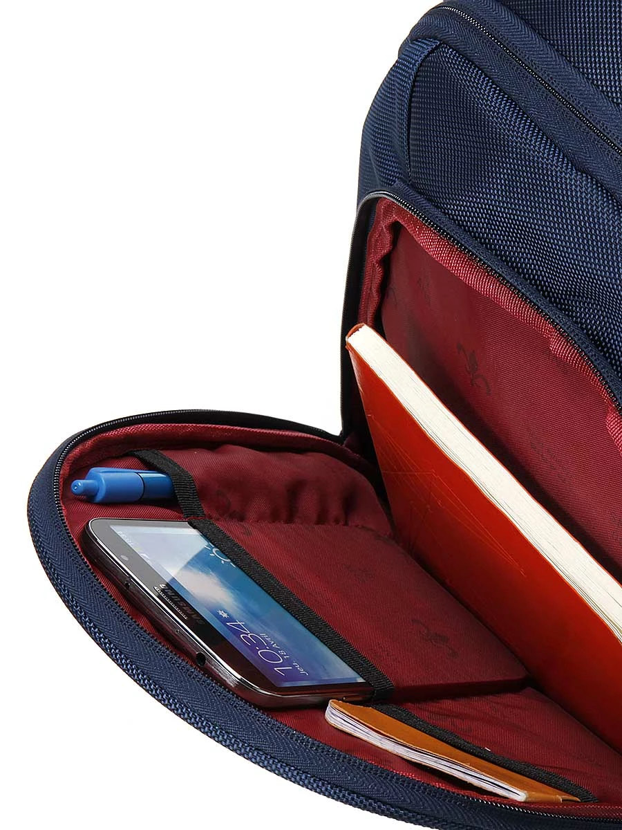 Le sac à dos Lys Cincinnati est équipé de deux compartiments. Le compartiment principal peut accueillir nombre de dossiers au format A4 et plus. Il est en outre pourvu d’une poche pour ordinateur jusqu’à 15.6 pouces. Le compartiment secondaire, plus petit, peut également contenir des documents format A4 et comporte une poche zippée en mesh idéale pour ranger le chargeur de l’ordinateur. Une grande poche frontale avec fermeture à glissière comporte un passant pour stylo, et deux poches plates parfaites pour une batterie nomade (non fournie) ou une carte de transport, par exemple. Un livre peut également trouver sa place dans cette poche pour un accès rapide. Deux petites poches latérales extensibles en maille filet sont pensées pour tenir des petites bouteilles isothermes ou gourdes.
