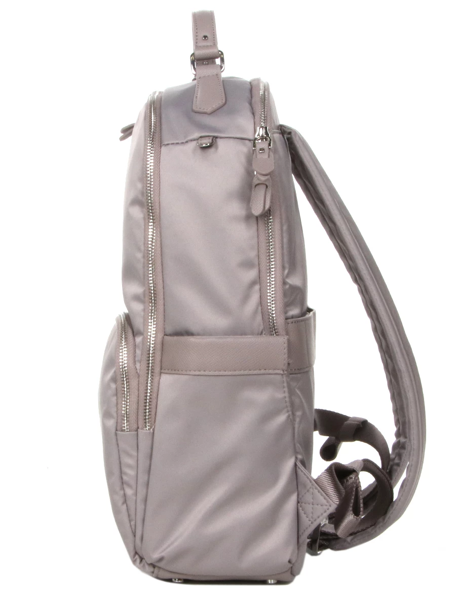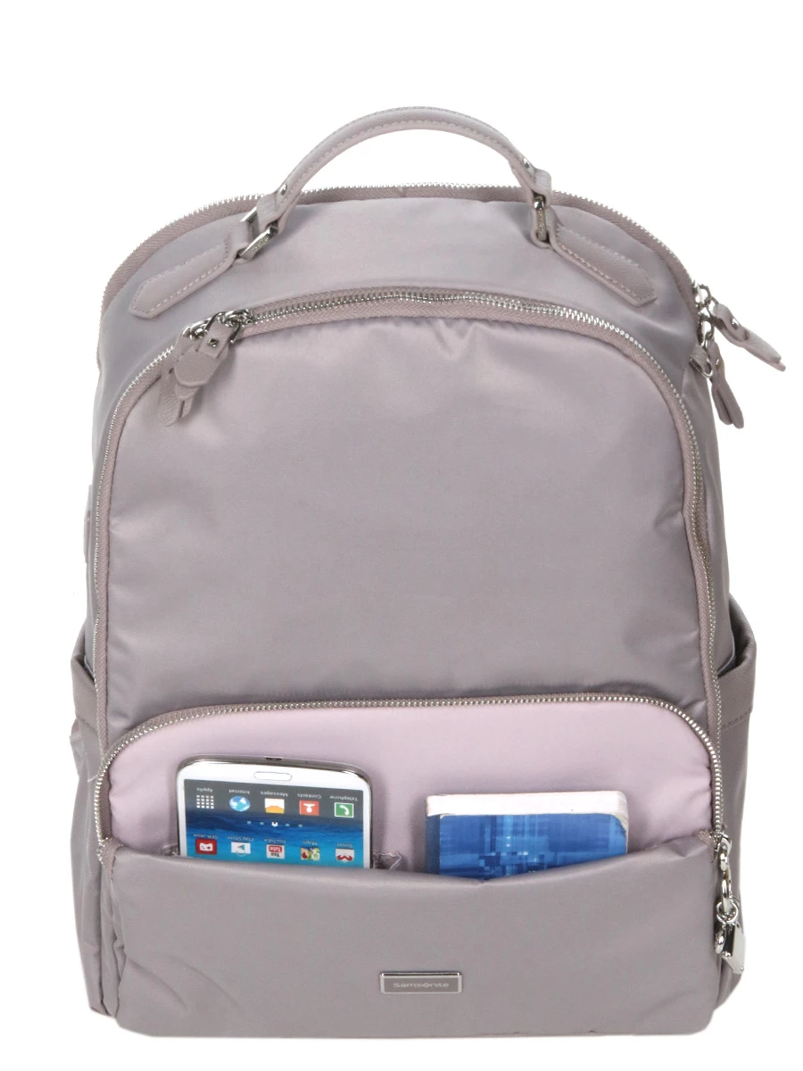 Le sac à dos ordinateur Samsonite Karissa Biz 2.0 – 14.1 pouces multiplie les dispositifs astucieux pour simplifier le quotidien des femmes actives ! Ergonomique et bien agencé, il promet des journées placées sous le signe du confort et de l’organisation. Les nomades connectées apprécieront particulièrement la présence d’emplacement renforcé pour ordinateur et tablette. Pour rester branché à l’actualité et aux mails tout au long du trajet, on peut compter sur son port USB permettant une charge rapide du téléphone (en ayant au préalable placé à l’intérieur une power bank non fournie). Son revêtement satiné en polyester recyclé, ses détails métalliques brillants et ses belles finitions en simili cuir participent à son look résolument élégant et féminin.