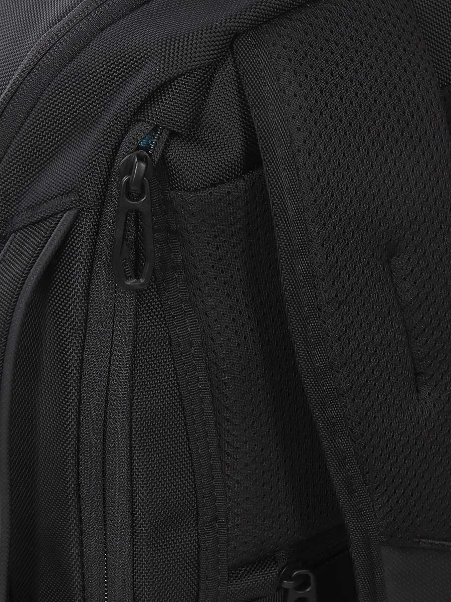 La paroi dorsale du sac à dos Thule Accent présente des empiècements matelassés au niveau des zones de pression. Ses bretelles sont réglables et rembourrées en mousse EVA anti-usure. Le dossier comme les bretelles sont recouverts de mesh pour assurer une bonne aération. Les bretelles peuvent être reliées par la sangle de poitrine réglable afin de mieux répartir la charge. Pour porter le sac à la main, la poignée haute est renforcée de mousse et une autre poignée est placée sur le côté. Pour faciliter les mouvements lors des départs pour plusieurs jours, le passant pour trolley permet de fixer le sac sur une valise à roulettes. Grâce à son revêtement résistant à l’eau et à ses fermetures à glissière inversée, le sac protège efficacement son contenu de l’humidité.
