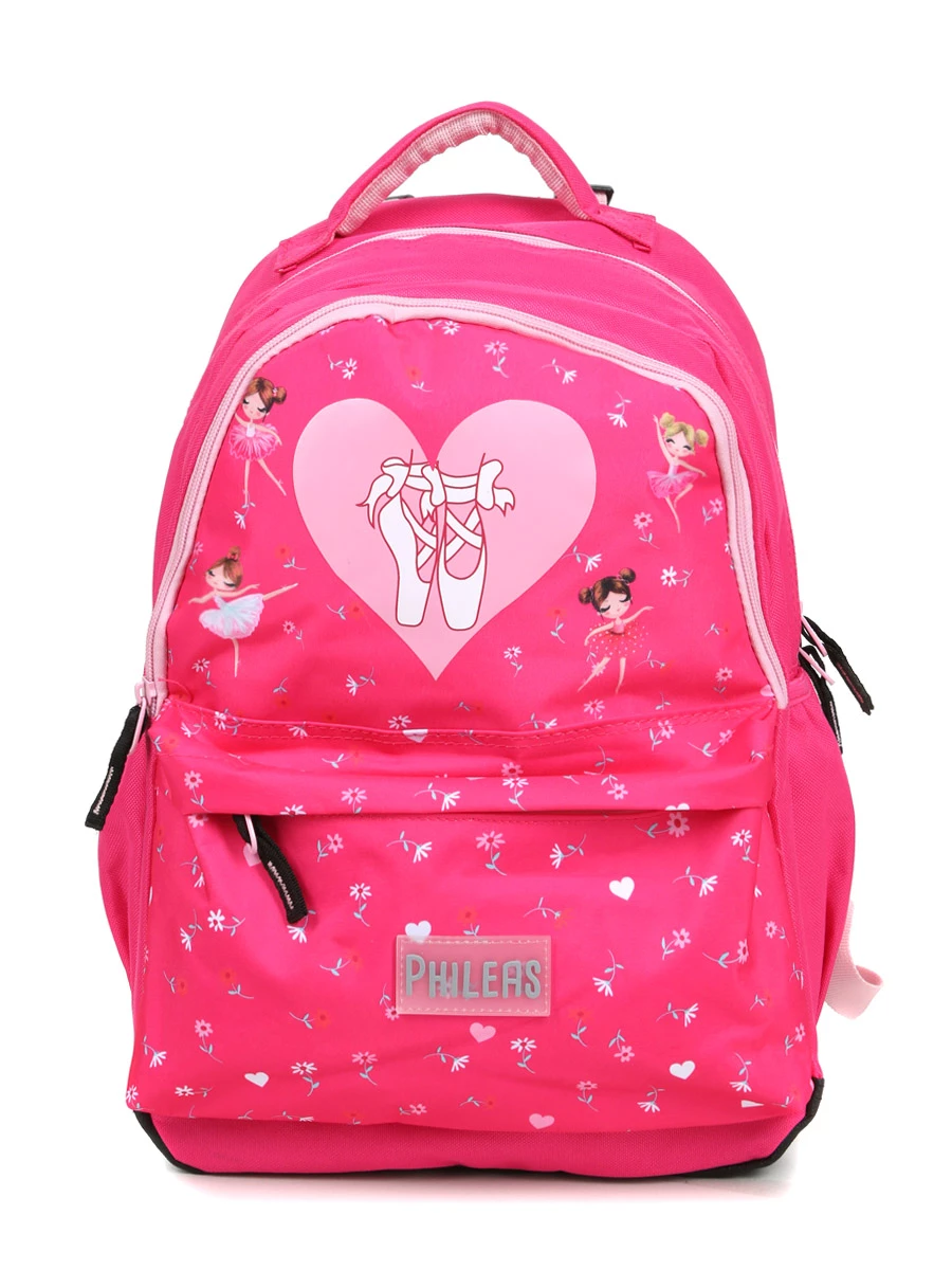 Le compartiment du sac à dos fille Philéas Fashion Ballerine loge les cahiers et les classeurs de formats A4 et 24 x 32 cm, ainsi que les manuels. Il cache une poche plate zippée, pratique pour mettre à part de petits éléments susceptibles de se perdre au fond du sac. La grande poche frontale permet de saisir rapidement la cahier de correspondance, l’agenda et la trousse. La poche avant plus petite loge par exemple le trousseau de clefs de la maison, le porte-monnaie et l’étui à lunettes. Enfin, une bouteille et un parapluie peuvent être glissés dans les deux poches latérales. Tous ces espaces de rangement sont dotés d’une doublure intérieure.