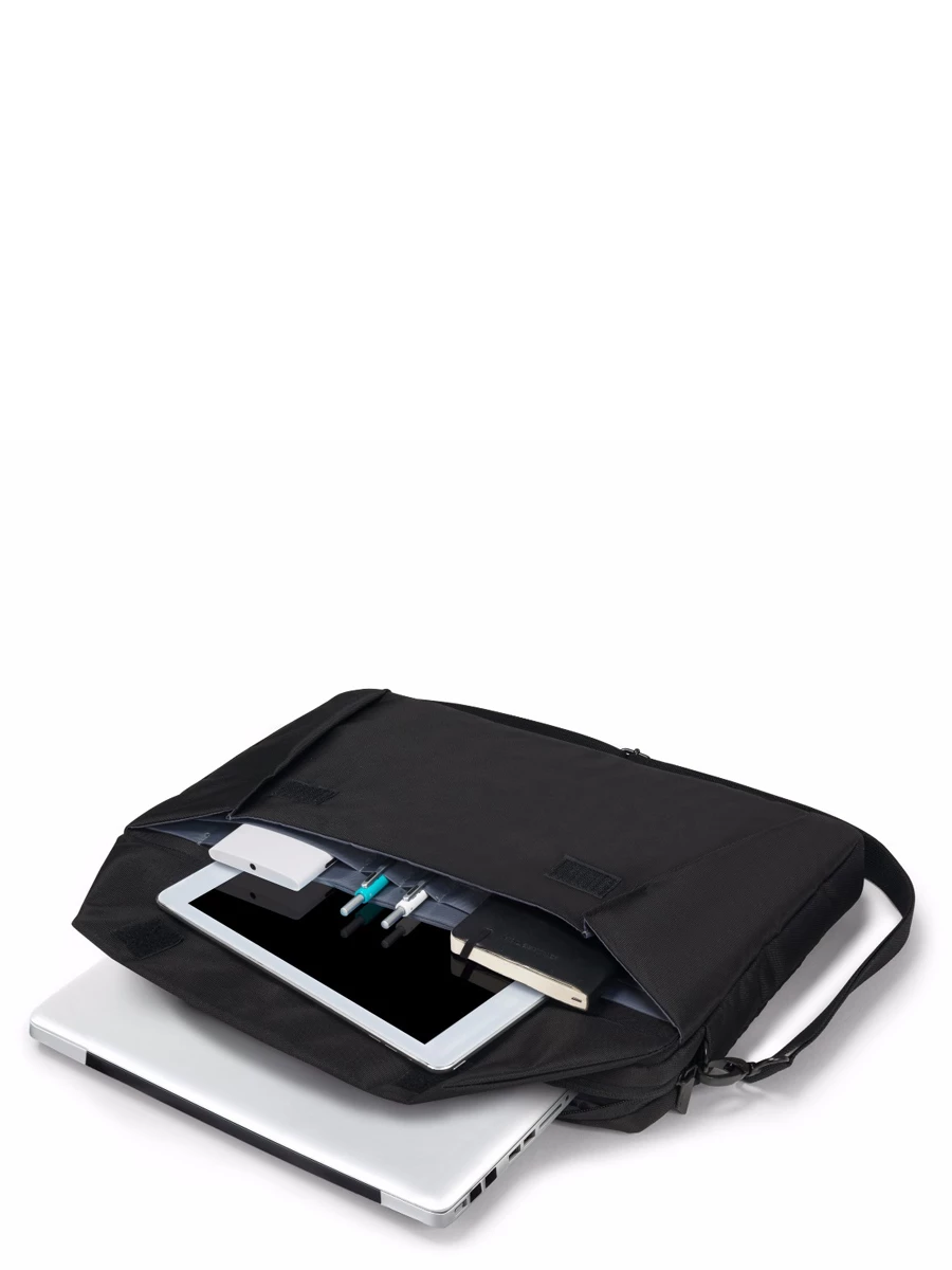 Le porte ordinateur Dicota Edge offre un compartiment renforcé parfait pour un MacBook ou un Ultrabook jusqu’à 13.3 pouces. Effets personnels et accessoires en tout genre peuvent trouver une place de choix dans sa poche frontale à rabat à attache velcro. Là, tablette 10.5 pouces, petites fournitures et stylos peuvent être glissés dans des emplacements spécifiques. A l’arrière, une large poche zippée permet de garder sous la main le portefeuille, le téléphone, la paire d’écouteurs, etc.