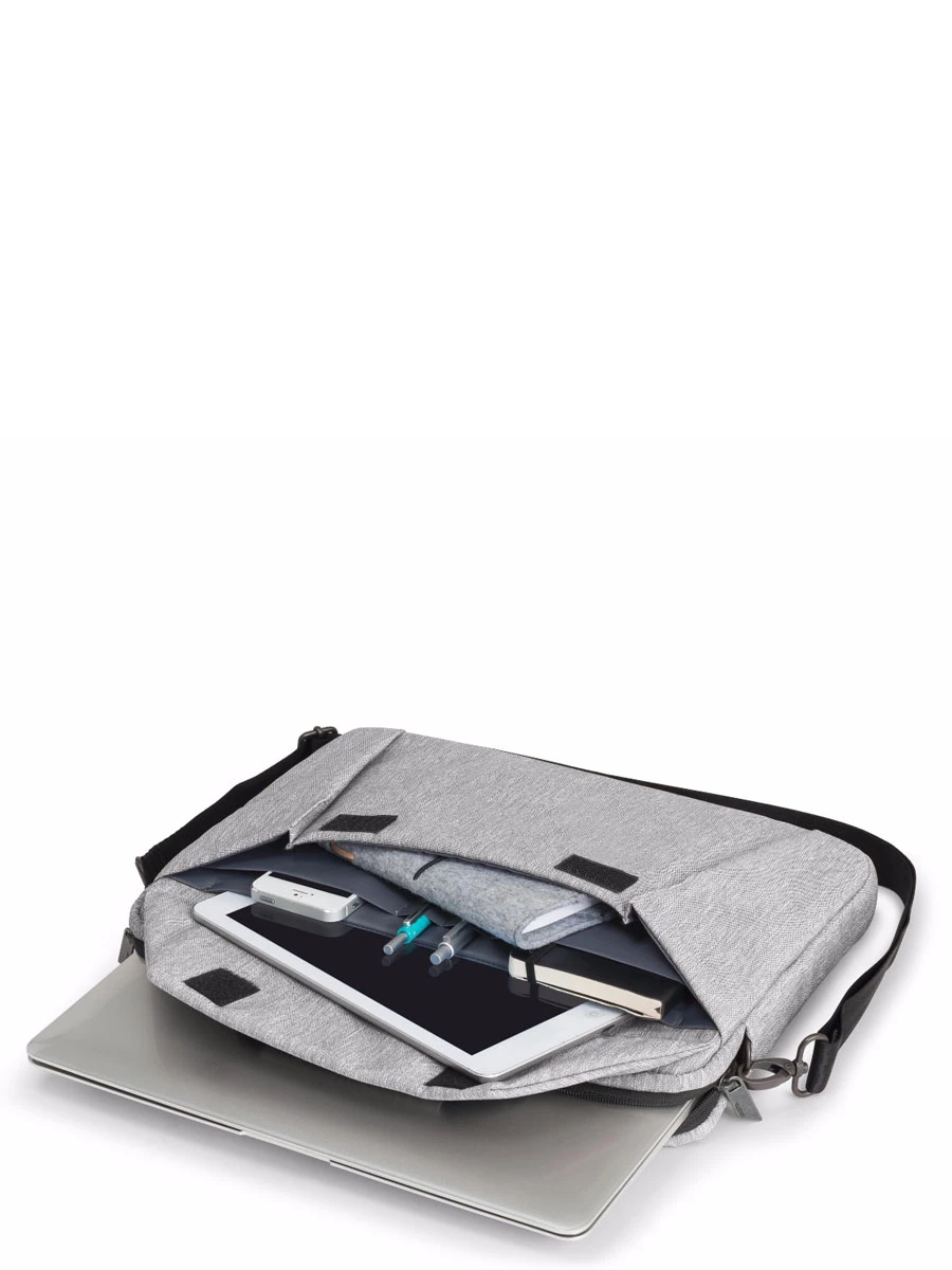 La sacoche Dicota Edge Chiné offre un compartiment renforcé à fermeture à zip inversé parfait pour emporter un MacBook ou un Ultrabook (jusqu’à 15.6 pouces) et quelques documents A4. Sa poche frontale dispose d’une poche tablette, de 2 poches plates pour petites fournitures et de 2 passants pour stylos. Le portefeuille et le téléphone peuvent être laissés accessibles en les glissant dans sa poche arrière zippée.
