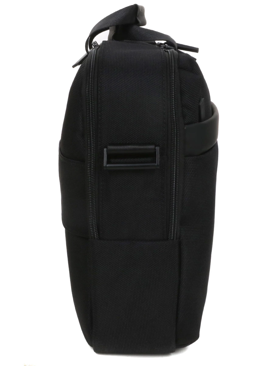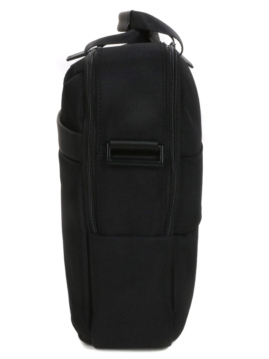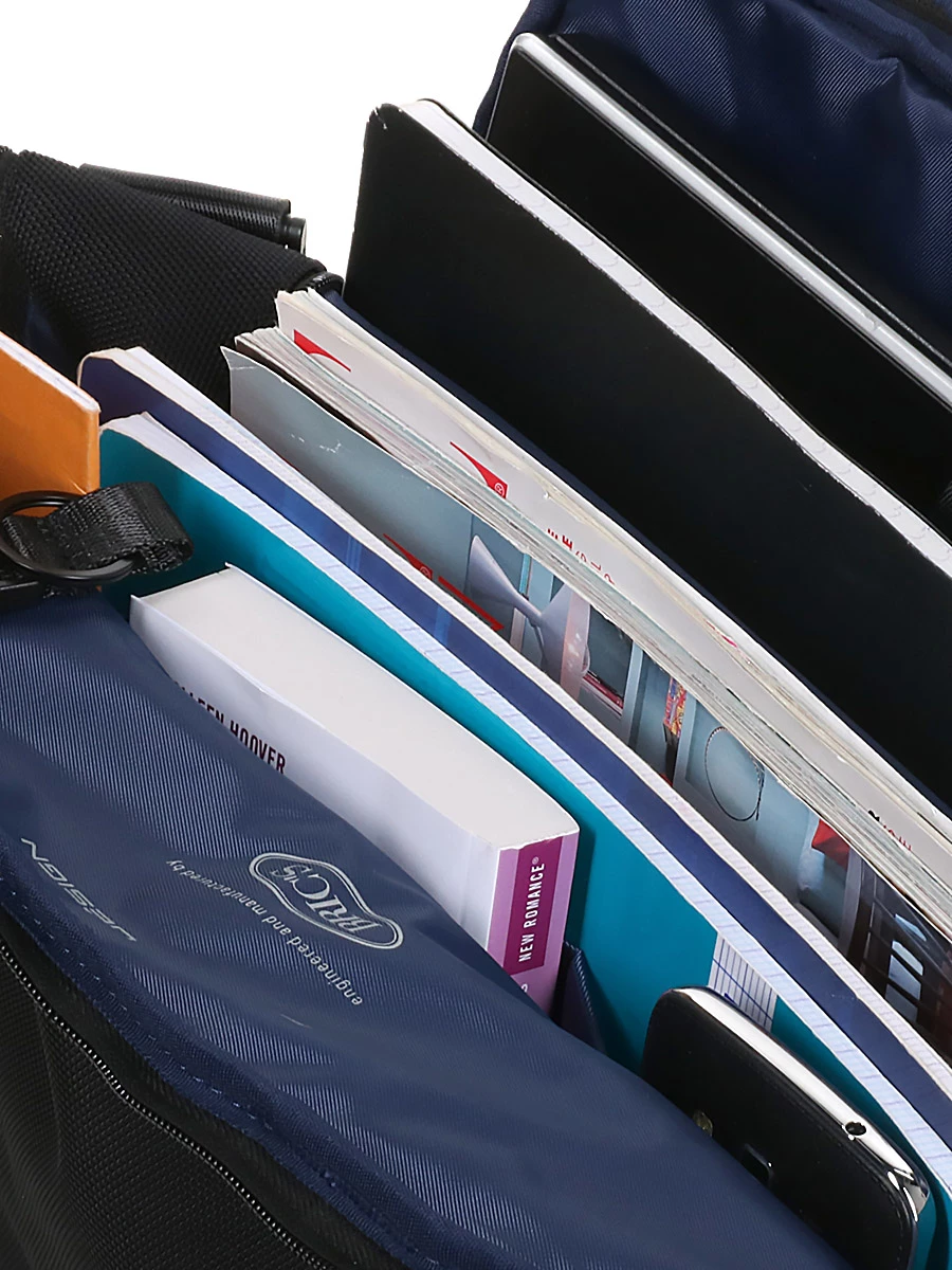 La sacoche business Porsche Design Voyager dispose d’un compartiment avant pouvant être dédié au transport de mémos, pochettes, documents techniques et autres support de réunions. Là, 4 poches ouvertes et une grande poche zippée permettent de sérier les fournitures de bureau, des petits calepins et divers accessoires multimédia. Le trousseau de clés peut être accroché à son attache porte clés pour ne pas risquer de tomber au fond du compartiment. Son compartiment arrière renferme quant à lui une poche matelassée adaptée pour emporter à l’abri des chocs un ordinateur jusqu’à 15.5 pouces. Les oublis et ajouts de dernière minute peuvent être glissés dans sa poche frontale spacieuse.