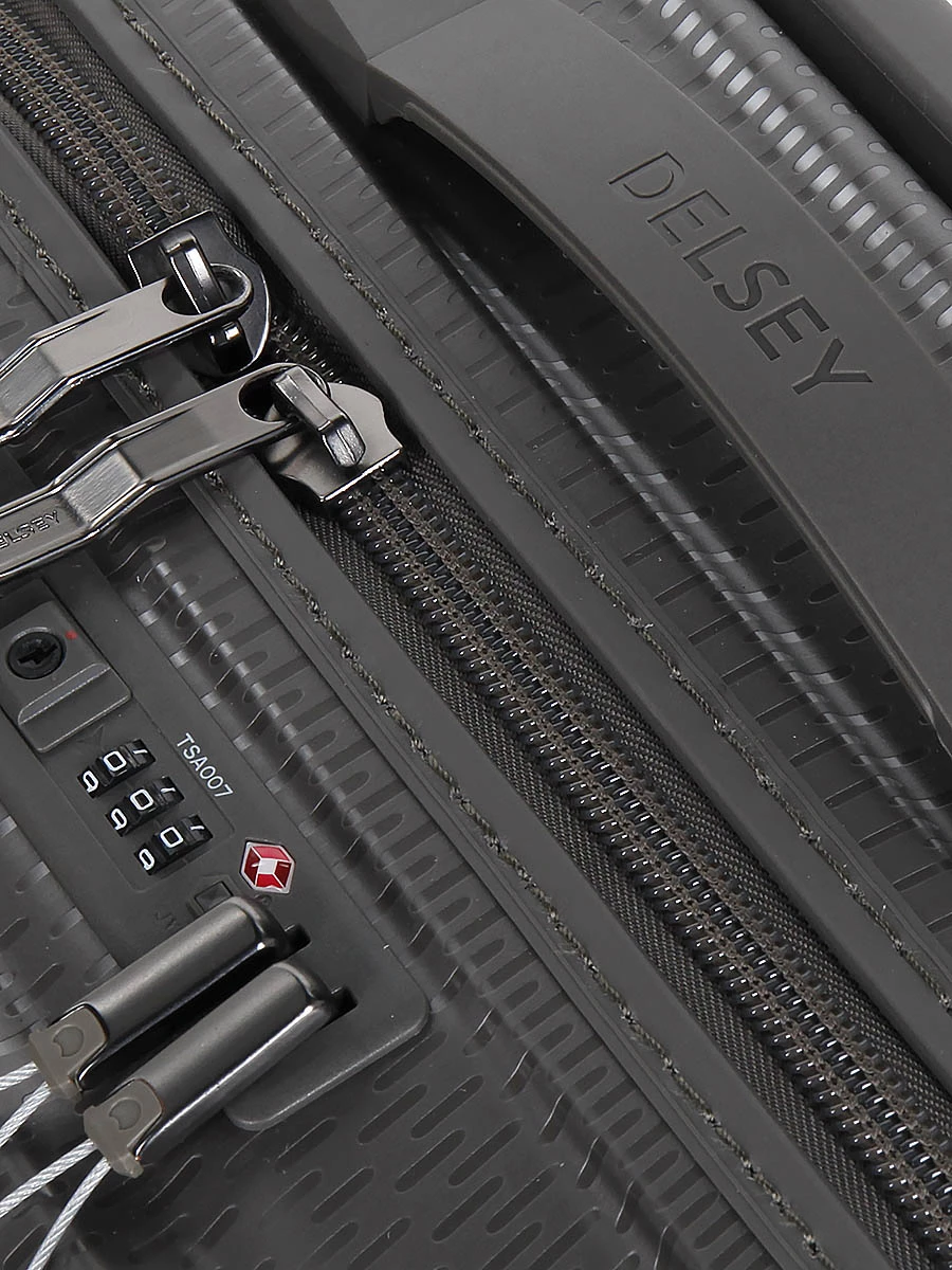 La valise 4 roues Delsey Turenne dispose de trois compartiments et deux ouvertures sur l’extérieur. Le compartiment frontal est dédié au numérique : il possède une poche pour ordinateur 15.6 pouces, une poche pour tablette, un rangement pour batterie nomade (non fournie) relié aux ports USB, et deux poches extensibles pour ranger accessoires et câbles d’alimentation. La paroi comprenant les poches matelassées peut se dézipper entièrement, offrant ainsi une seconde ouverture et une capacité plus importante aux compartiments pour le linge. Ceux-ci sont séparés par un plateau zippé comportant une grande poche en maille filet pour les accessoires. Le compartiment inférieur est en outre muni de deux sangles ajustables. Pour les vêtements portés et les chaussures, il est fourni avec deux sacs amovibles.