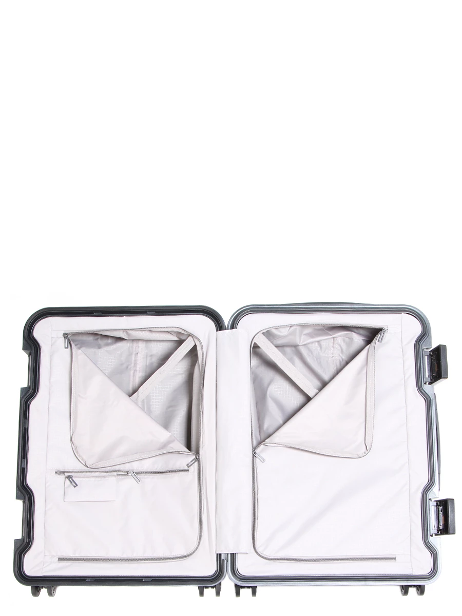 La valise 4 roues Titan Litron Frame M renferme 2 compartiments pourvus d’une espèce doublure en polyester recyclé. Pour limiter les faux plis, les vêtements bien pliés peuvent être maintenus en place à l’aide de 4 sangles de maintien réglables et de 2 plateaux séparateurs souples zippés. De petits accessoires peuvent être déposés dans l’une de ses 2 poches intérieures. La plus petite des 2 peut être réservée à quelques bijoux ou un trousseau de clés, par exemple.